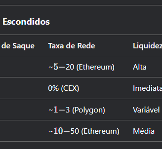 - Taxas: Custos de gas na rede Ethereum (variam conforme congestionamento).